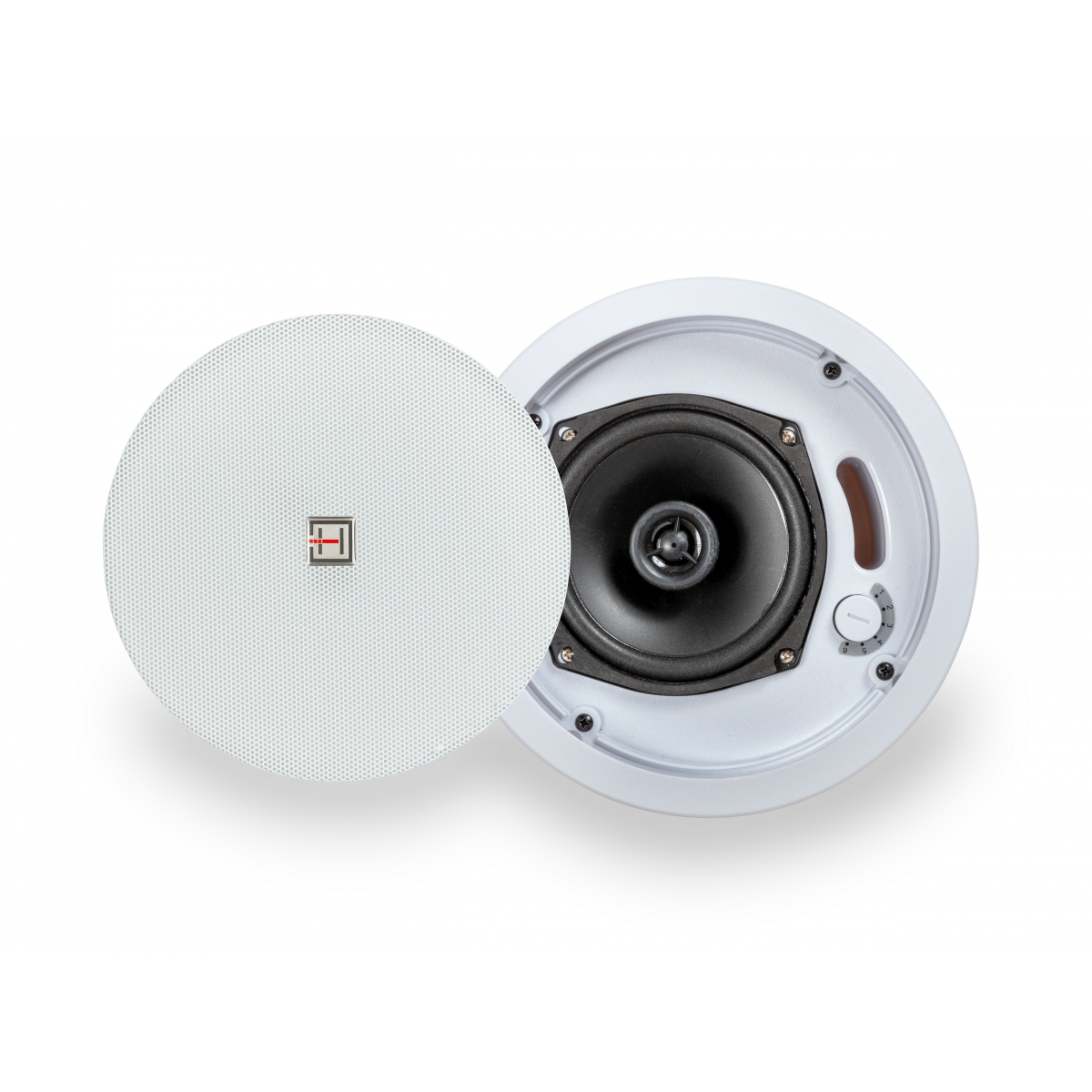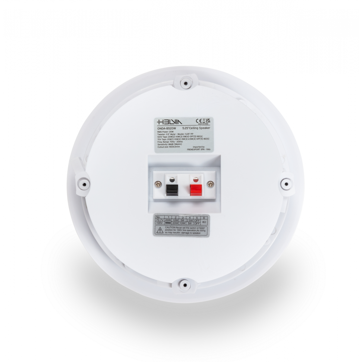 Installation is very easy, thanks to the quick mounting system with 4 screws. These screws are hidden behind the grill and offer an elegant and minimalist design. The built-in line transformers allow use with 70/100V lines and offer three power taps plus 8ohm to better adapt to different speaker arrangement and amplifier powers. They come in white color but can be painted in any color.