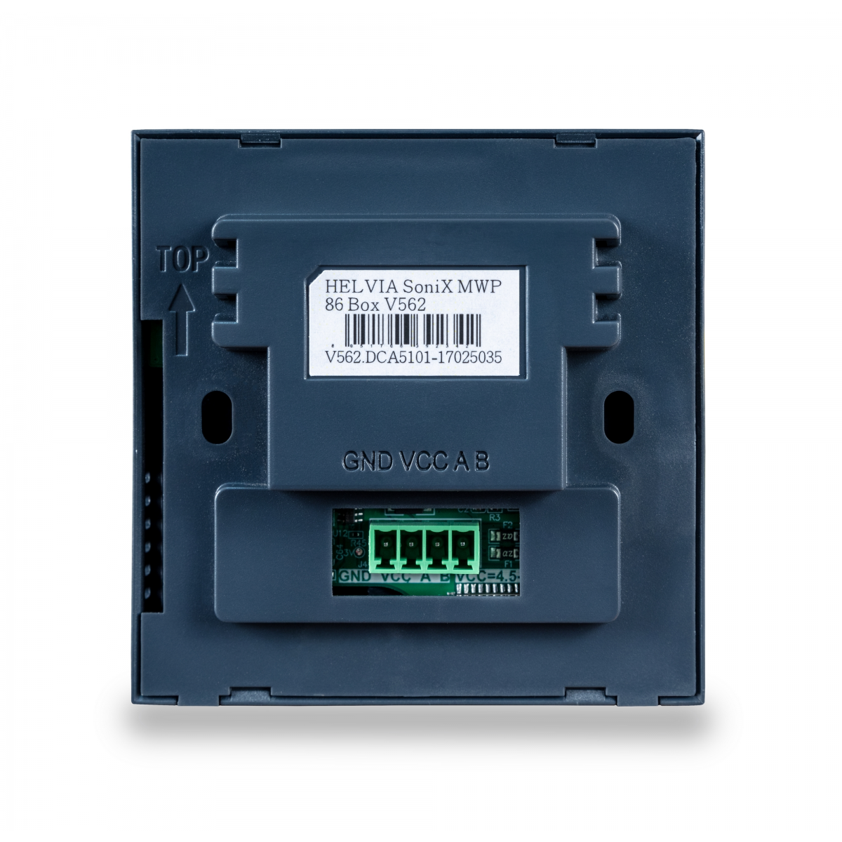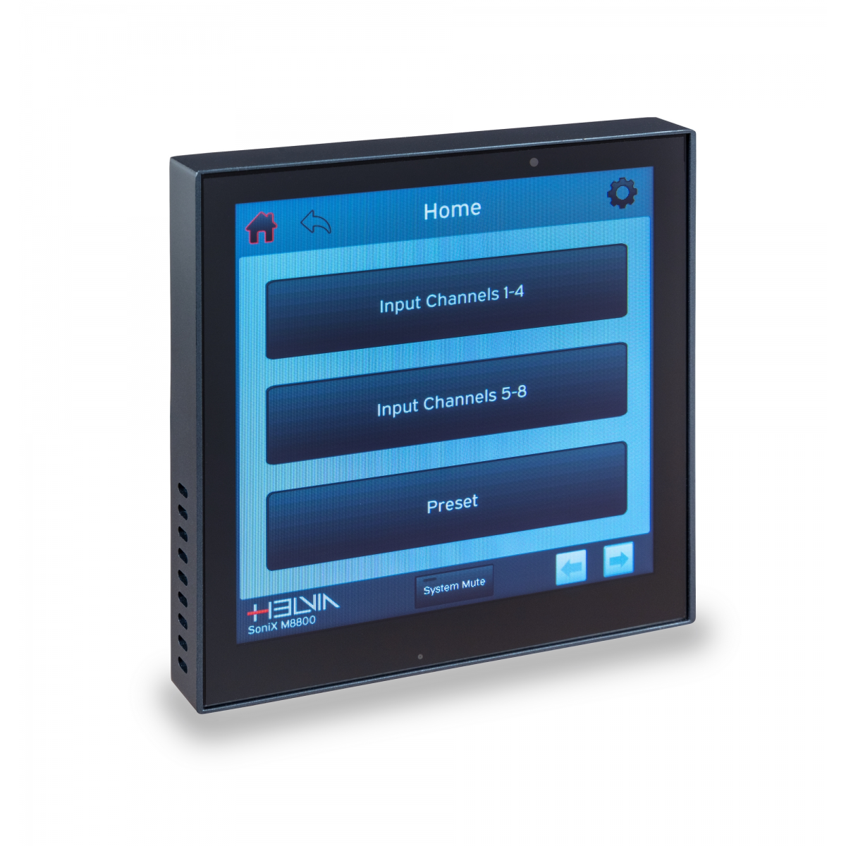 The SoniX MWP is an in-wall control with a 4” color touch screen designed to control input volumes, mutes, and 8 preset recall of the SoniX M8800 matrix. It comes with an external power adapter, all adapter cables to the standard RJ-45 serial connection, and 80x80mm recessed wall box.