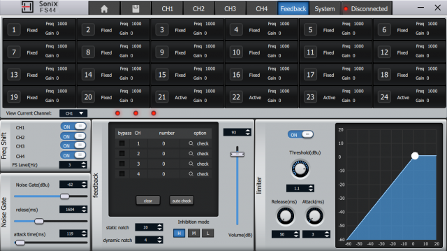 Il cuore dell'elaborazione SoniX FS44 sono i 24 filtri notch automatici per ogni canale con funzione di analisi automatica. Il mix di filtri notch statici o dinamici può essere impostato manualmente in base alla "problematicità" dell'acustica in cui il processore lavora.