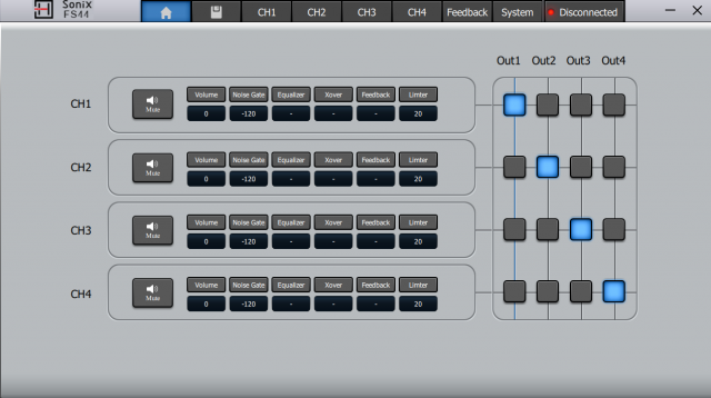 SoniX FS44 è basato su un processore SHARC di quarta generazione da 450 MHz/32 bit. La conversione AD/DA è a 24 bit con frequenza di campionamento di 96 kHz. Ogni canale è dotato di Phantom a 48V, Noise Gate, equalizzatore grafico a 6 bande, filtro passa-alto e filtro passa-basso, correzione automatica dello spostamento di fase/frequenza e limitatore.